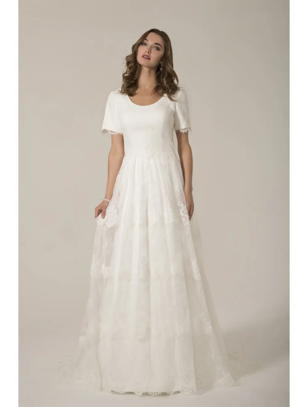 Abito Da Sposa In Pizzo Con Maniche E Scollo A Barchetta Con Gonna Ampia