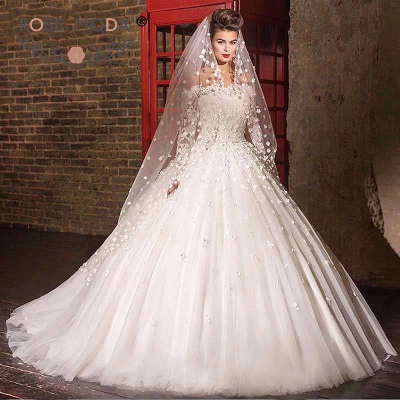 Us 349 0 Rosa Moda Di Lusso A Maniche Lunghe Abito Da Sposa 2019 Con 3d Fiori Off Spalla Pizzo Abito Da Sposa Con Maniche In Abiti Da Sposa Da