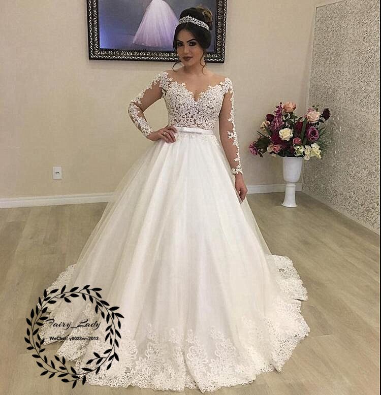 Acquista Oniriche Puffy Una Linea Di Abiti Da Sposa Con Maniche Lunghe 2018 Puro Pizzo Appliques Scollo A V Bianco Abito Da Sposa Le Donne A 184 67