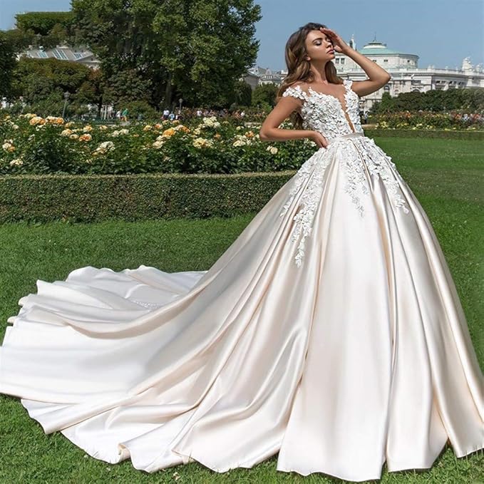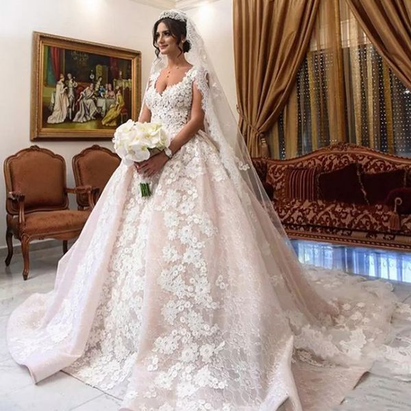 Acquista Lussuosi Abiti Da Sposa Principessa 3d Appliques Floreali Cap Sleeve Ball Gowns Abiti Da Sposa Cappella Treno Plus Size Abito Da Sposa A
