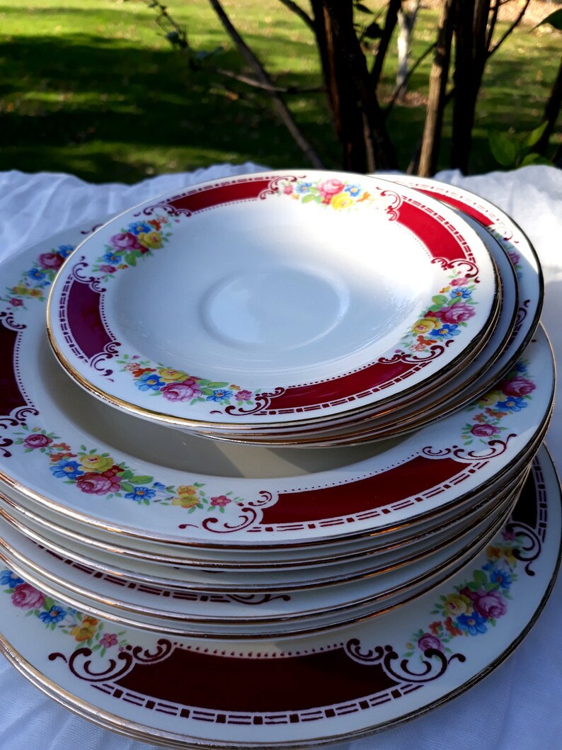 Vintage Homer Laughlin Brittany B1324 22k Gold Trim Country Floral Flourishes Burgundy Rims 13 Pieces Saucers Rim Bowl Dinnerluncheon Plates