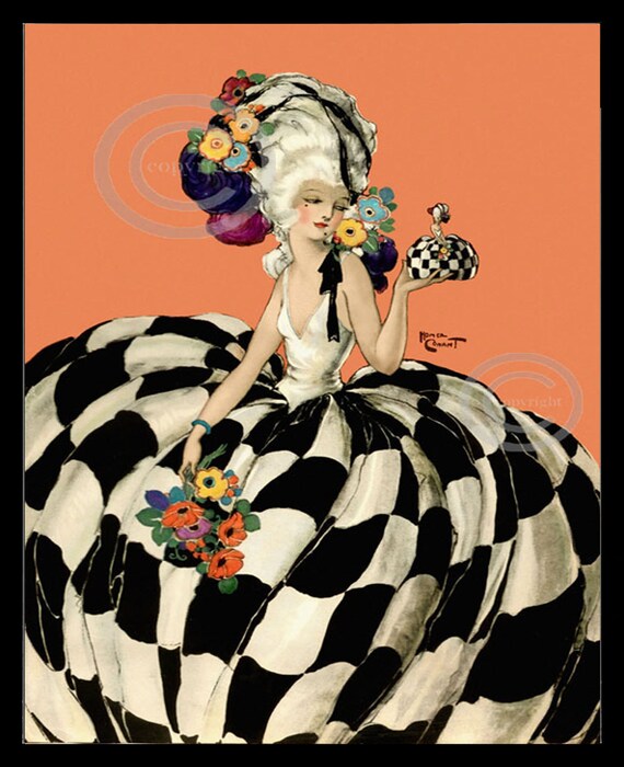 Rococo Homer Conant Print Madame Pompadour In Ballgown Vanity Powder Dish Black White Checkered Dress Flowers Giclee Art 12x18 1920s