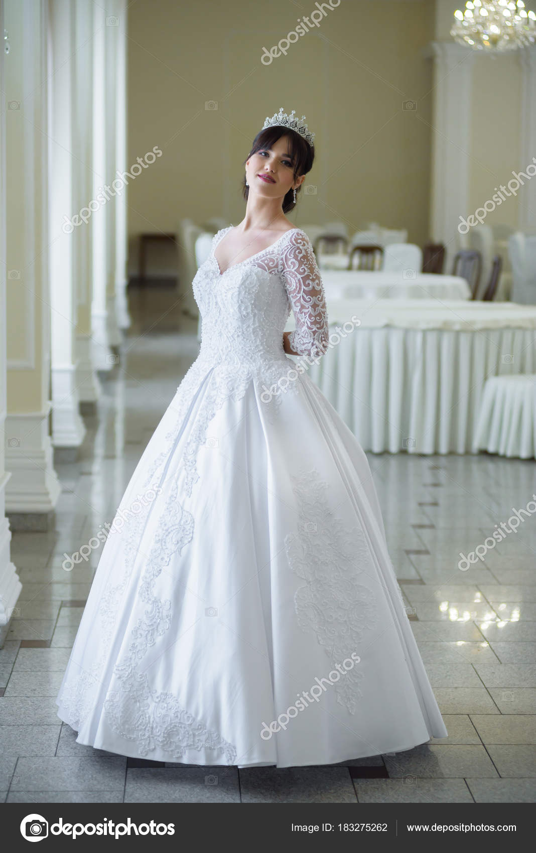 Bella Sposa Castana In Vestito Da Sposa Bianco Con Grande Wh