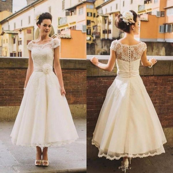 Acquista Abiti Da Sposa Corti Lunghezza Tè Vintage Anni 50 In Pizzo Tulle Modesta Manica Scollo A V Abiti Da Sposa Da Spiaggia Della Boemia 2019